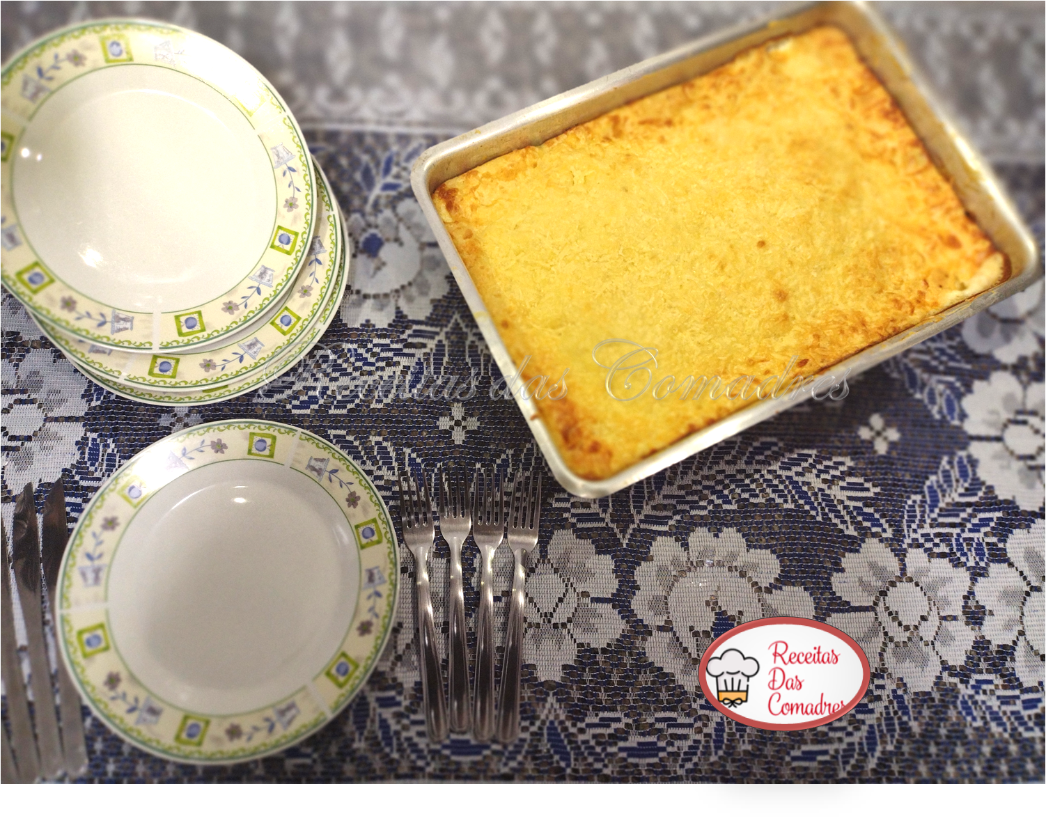 Unte uma forma de tamanho médio para grande com manteiga e farinha de trigo. Despeje metade da massa. Coloque todo o recheio. Cubra com uma camada de requeijão e outra camada de queijo mussarela por cima (igual à uma lasanha). Despeje o restante da massa e jogue o queijo ralado por cima de toda massa. Leve a forno em temperatura média por aproximadamente 30 minutos, ou até dourar.